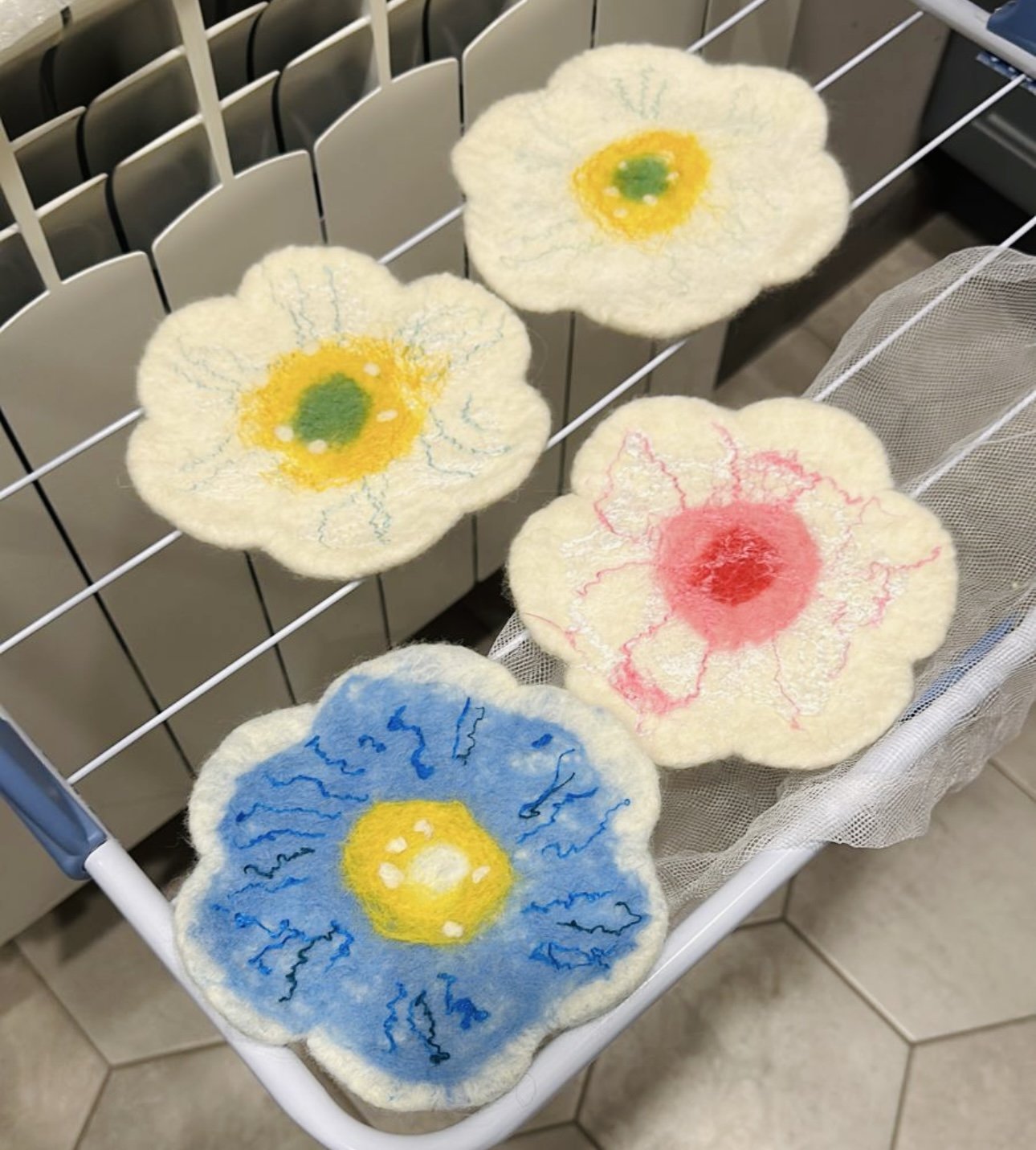 Попробовали с дочкой (10 лет) сделать подставки под горячее по бесплатному мк. Валяли впервые- очень понравилось. Объяснения очень понятные, даже ребенок справился. Все родственники с подставками от дочи теперь. Спасибо за мк.