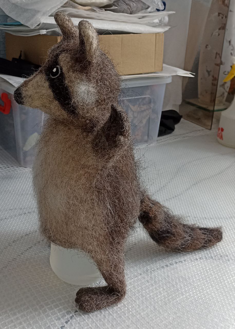 my last workshop with Yara was the racoon. Yara tried a new way between self working according to the prerecorded videos and life sessions to clarify any uncertainties and questions. I like this way very much. I'm very happy with my raccoon puppy. His role will be to be a conversations partner in the speech therapie and I'm sure he's doing his job well. As cute as raccoons may look, they can still cause some damage in the garden.