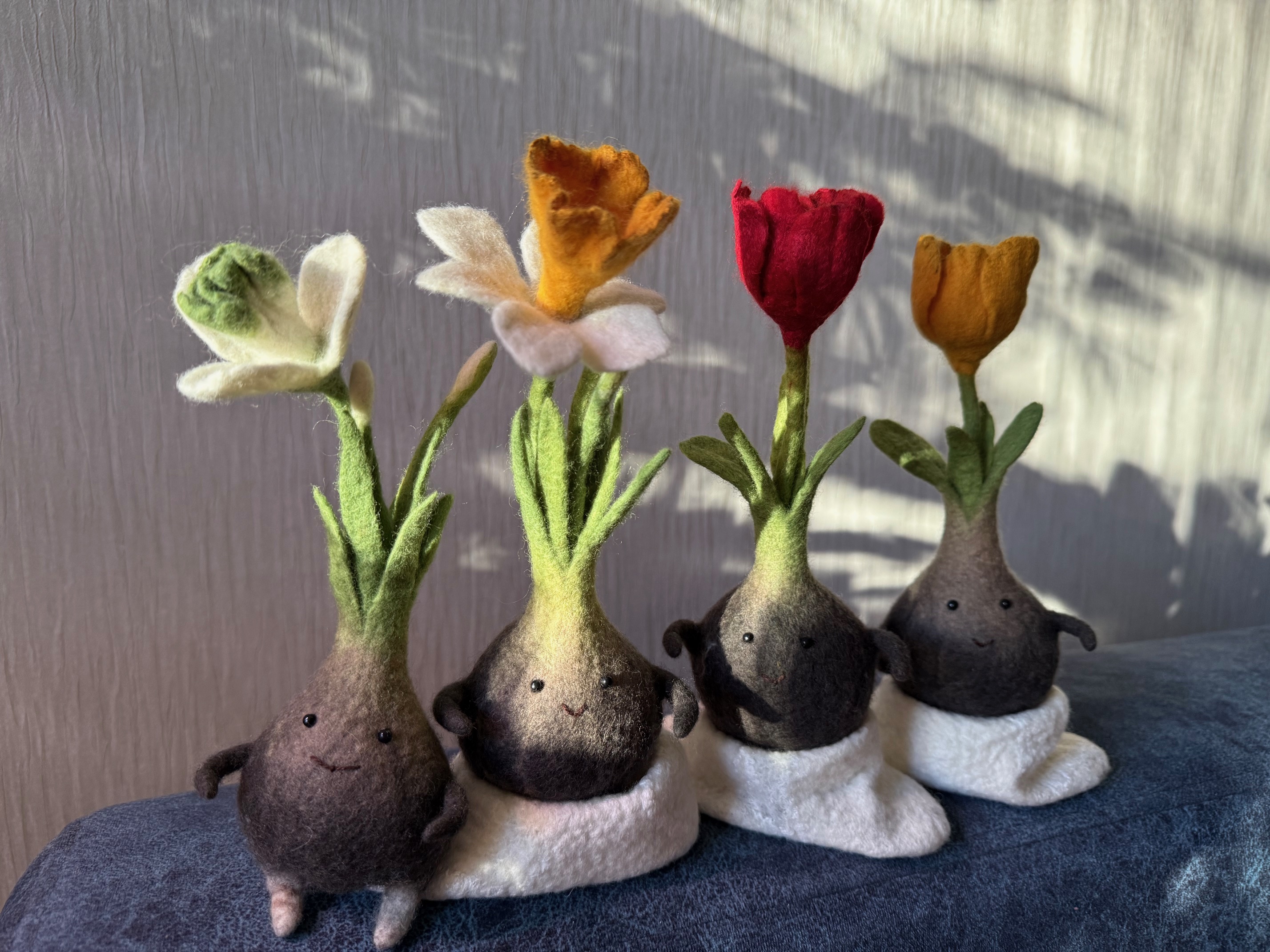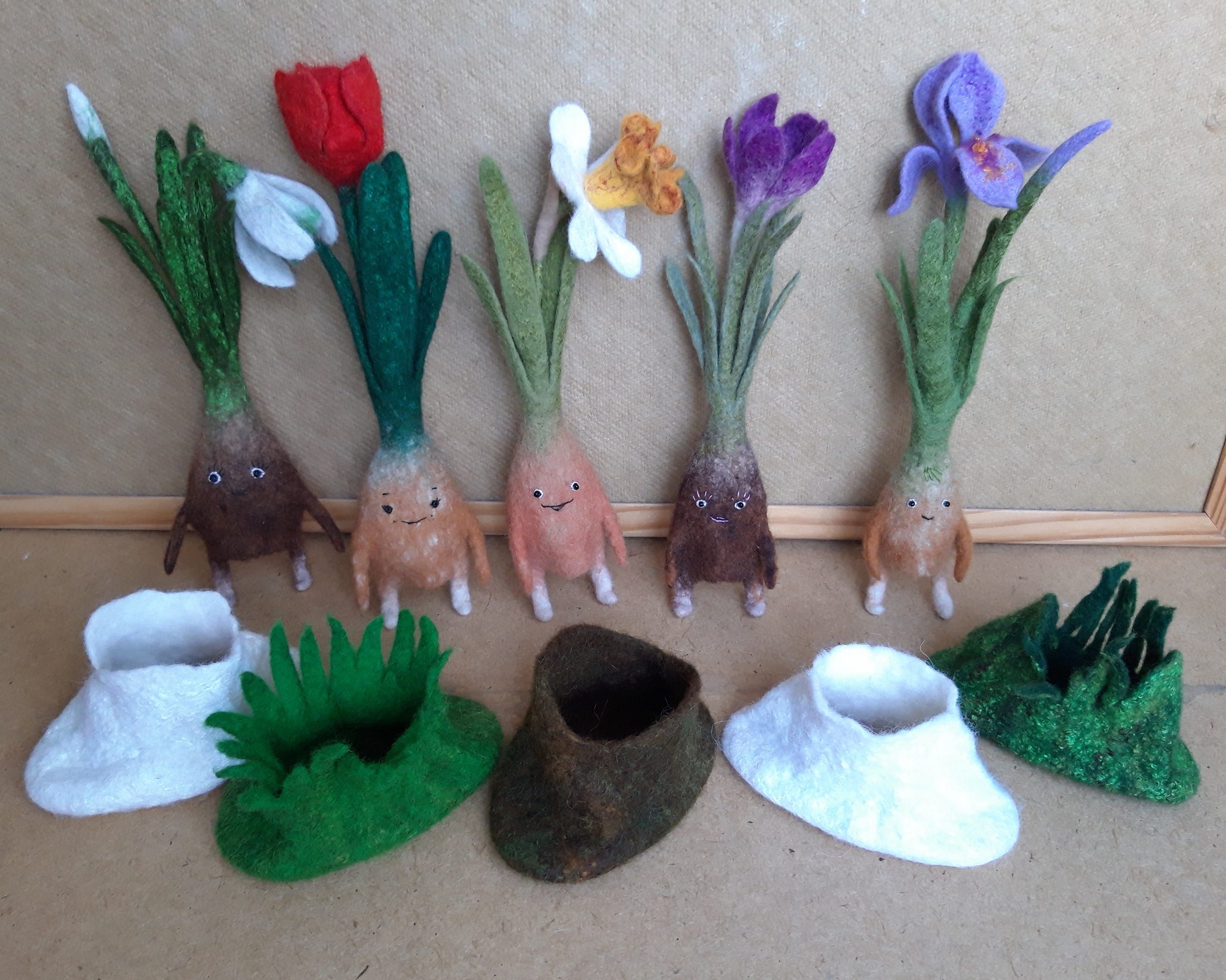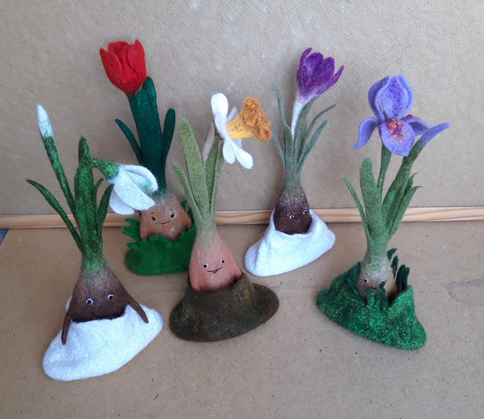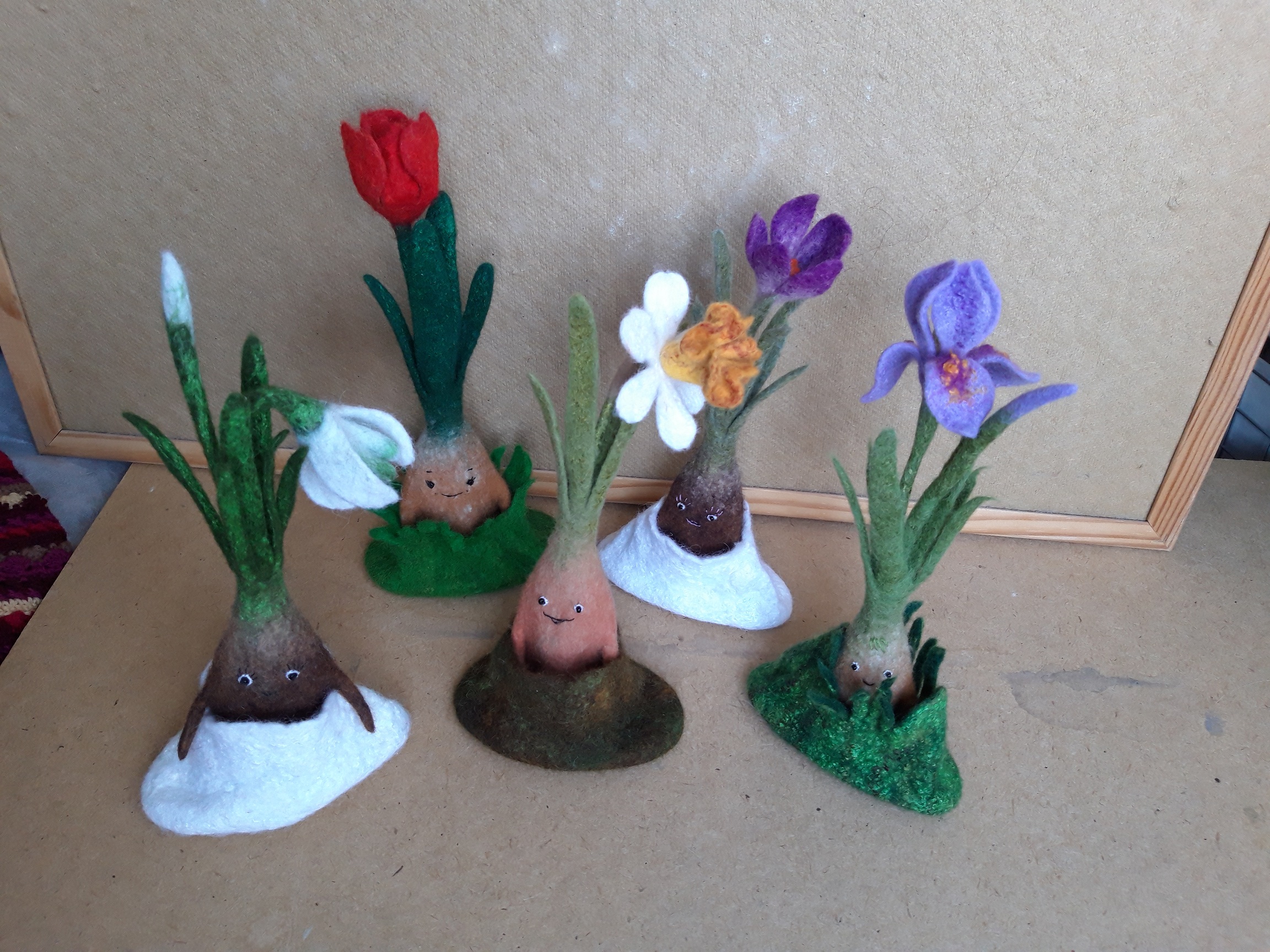 Свалялись весёлые луковички.Очень вдохновляющий, весенний курс по чудесным цветочкам! И,как водится, Ярослава предложила дополнительные варианты цветов с пояснением особенностей валяния оных. Я ещё раз убедилась, что валять надо из качественной шерсти- из мериноса свалян только крокус,ирис свалян из префельта, всё остальное - из семёновской и троицкой шерсти, которые очень плохо усаживаются и результат немного не тот. "Опыт - сын ошибок трудных"(хотела использовать домашние запасы шерсти), но всё равно я довольна. Другие варианты цветов буду валять уже из мериноса. Ярослава, благодарю за знания и вдохновение!