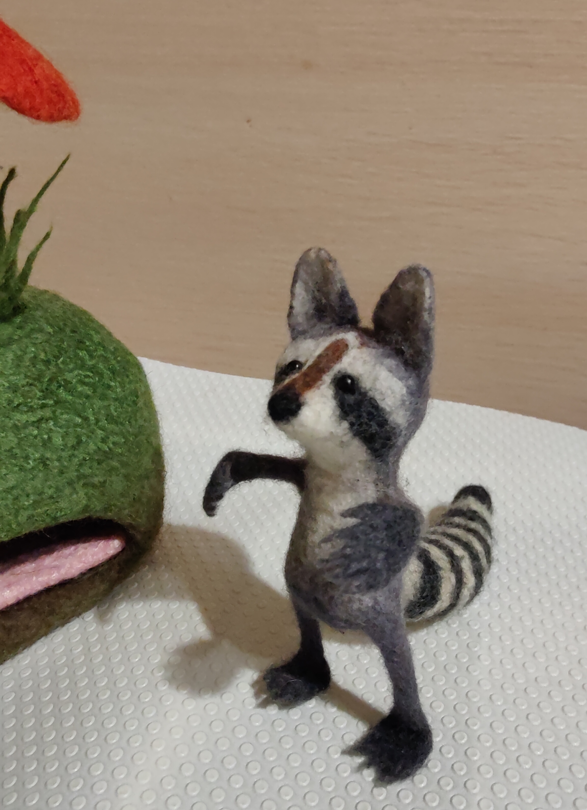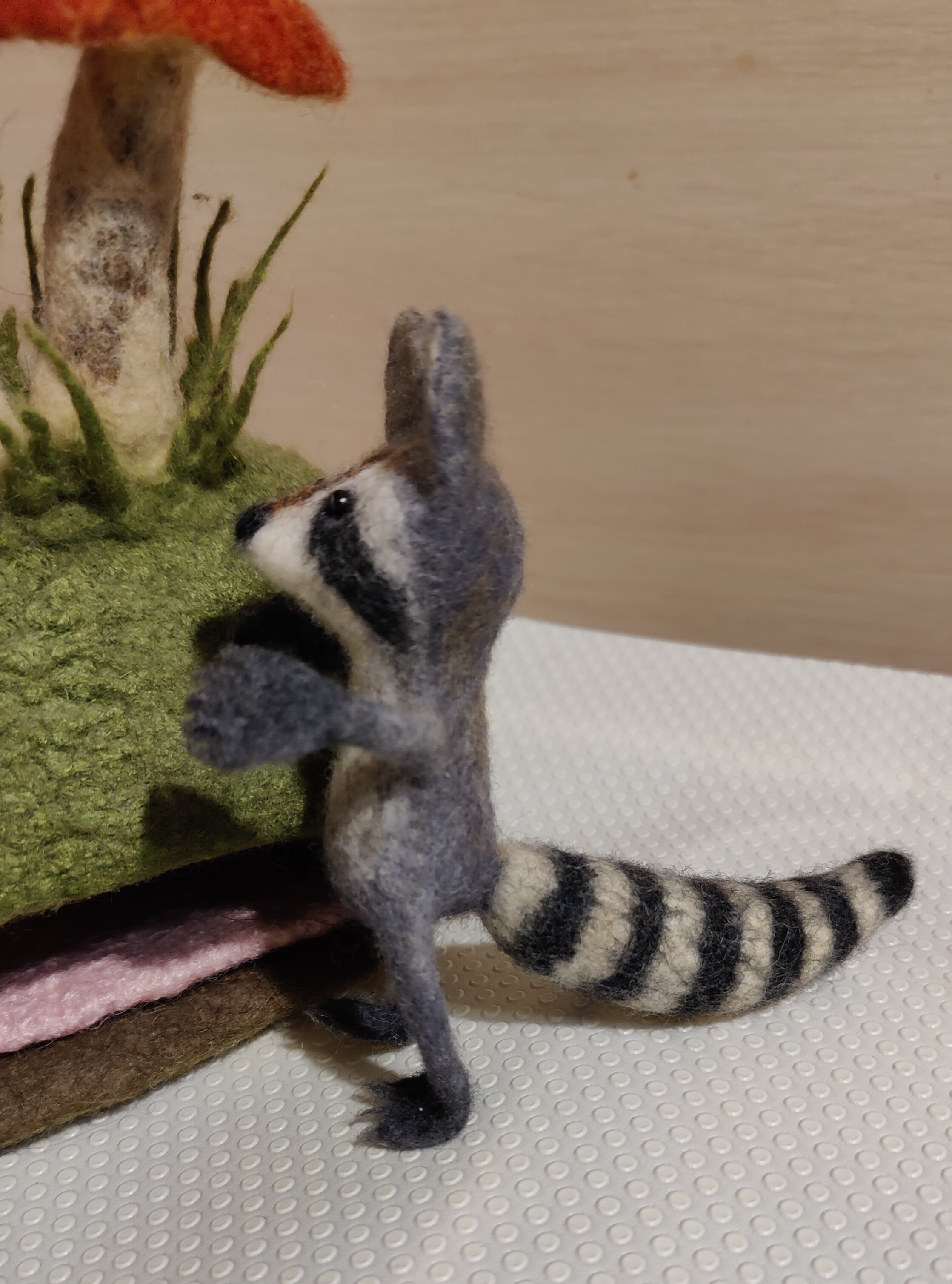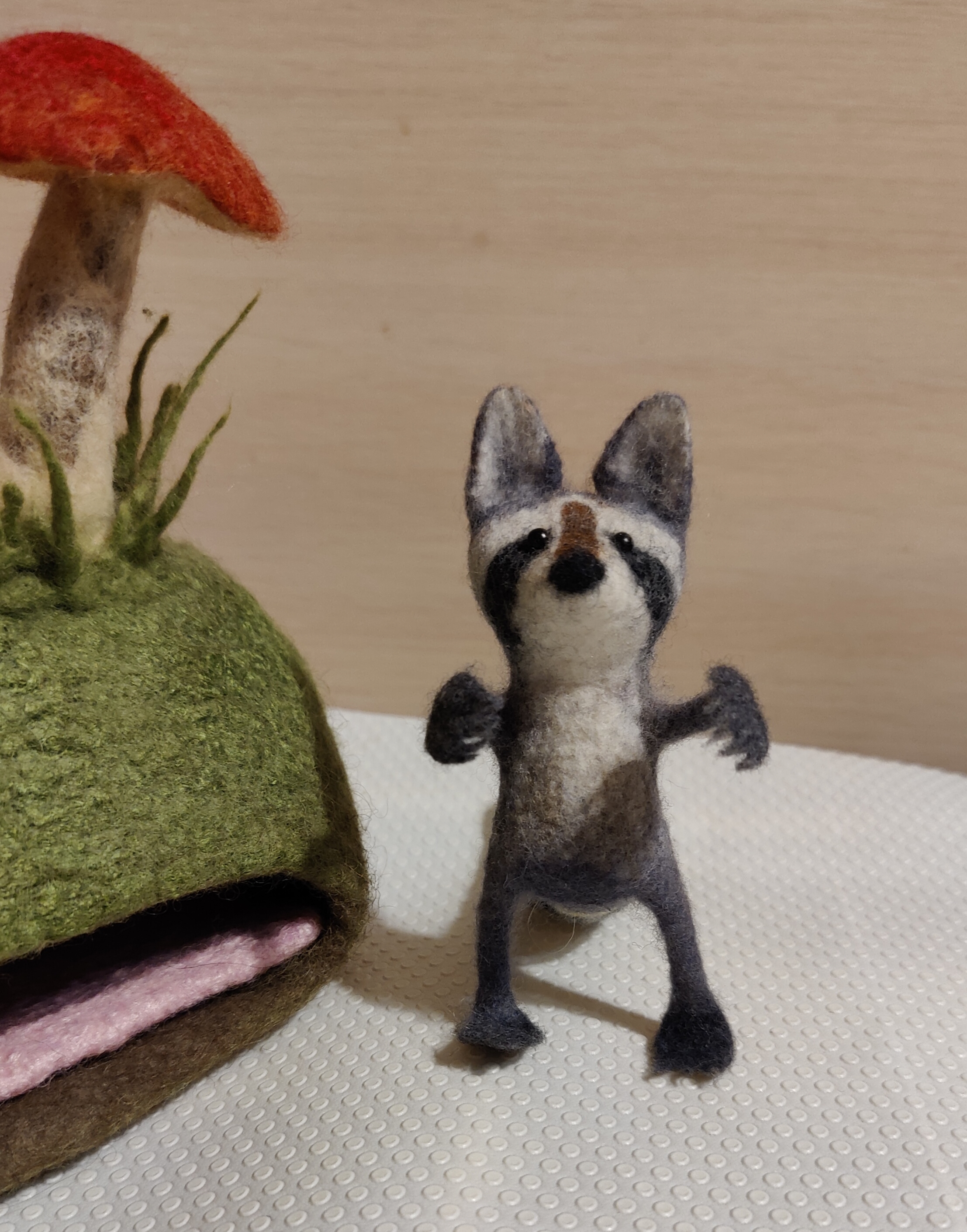 Яра, спасибо за чудесные мастер классы, в которых наглядно и детально объяснено, как создавать валяных зверушек. Это мой енотик, с большими ушами, и загребущими лапками. Собрался что-то схватить...