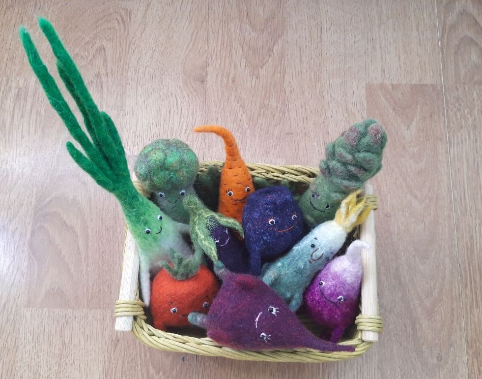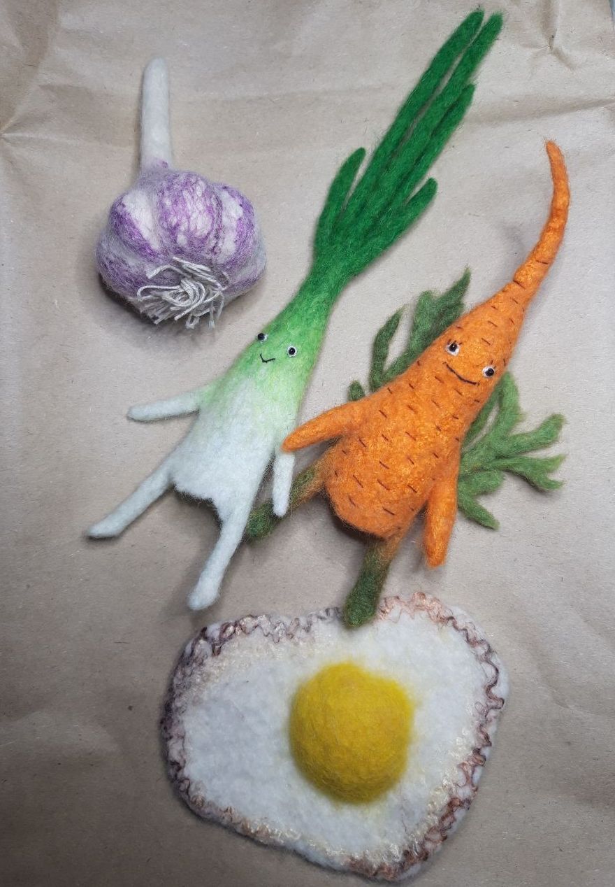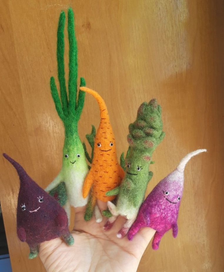 Ярин мухомор вернул меня к валянию и появилась команда овощей и одна ягодка: лучок-здоровичок(не дурачок)), огурец - молодЕц, а может быть мОлодец, бурачок- бодрячок, спаржа - хорошая маржа, помидор - весны амбассадор, морковь -любовь(классика), редиска- без комментариев. Далее должен следовать слоган:" А кого выберешь ты?" И нараспев:"Что наша жи-изнь - игрра!" Ярослава, спасибо за настроение и доходчивые объяснения. Курс по овощам очень ёмкий и насыщенный не только по количеству героев, но и по техническим приёмам