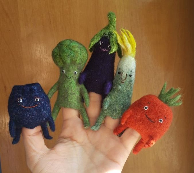 Первая партия моих пальчиковых овощей уже нашла саоих маленьких и больших огородников. Их дарили даже взрослым увлеченным дачникам. А это пошла вторая партия. Морковка и помидорка готовы, зелёный лучок и баклажан ждут доработки. Прекрасный курс - лёгкий, но очень вариативный и насыщенный! В планах добавить фрукты, ягоды. Благодарю, Яра, за постоянные творческие импульсы, которые очень нужны нам!