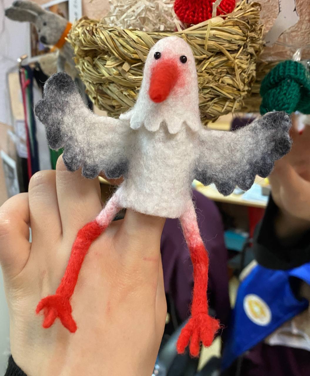 Увидела пальчикового аиста на одном из фото Ярославы, решила попробовать свалять по фото. Навыки к тому времени имелись, пришлось только подумать над оперением на шее и над доработкой базовой выкройки. Спасибо за курсы, Ярослава!